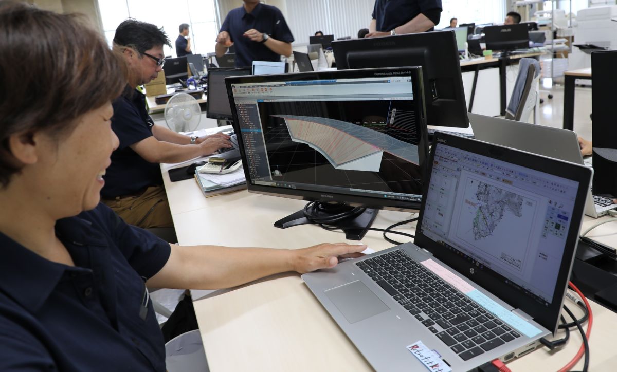 これらは、自社で管理も施工も行える【元請直営施工体制】をとっている大陽開発だからこその強みであり、3次元起工測量・3次元設計データ作成・ICT建機による施工・3次元出来高管理に至るまで、ICT施工のすべてのプロセスを自社内で完結しています。このことによって、本当の意味でのコストダウンが図られ、ノウハウも社内に蓄積されていくのです。