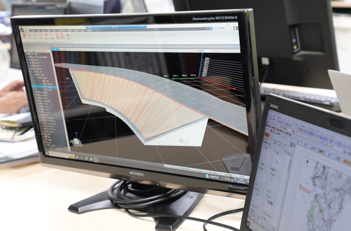 測量で取得した3次元データや設計図書(2次元CADデータ)をもとに、3次元の設計CADデータを作成します。このデータは、設計照査に利用したり、ICT建機を使用するための入力データになります。