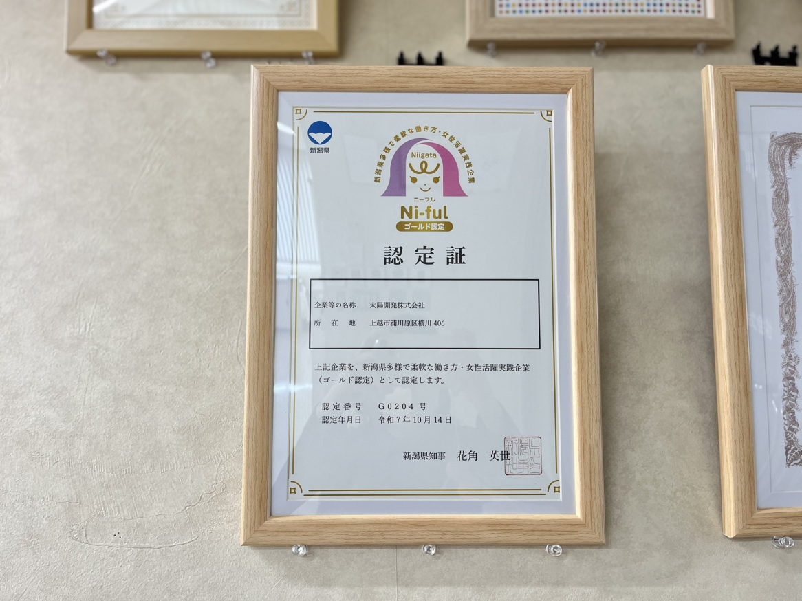 「新潟県多様で柔軟な働き方・女性活躍実践企業認定制度(Ni-ful(ニーフル))ゴールド認定」を受けました!