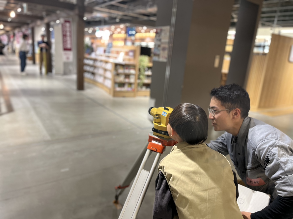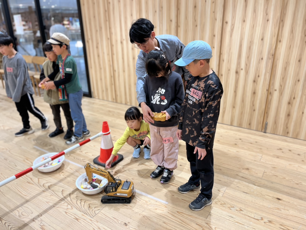 建設業では着手前、施工中、引き渡し検査で常に必要となる測量についても学んでもらおうと"レベル測量"にもチャレンジしてもらいました。そして建設業と聞くとやはり大きな重機の印象が強いと思います。が、さすがに重機を持ってくるのは大変ですので"ラジコン重機"で重機操作を体験してもらいました。