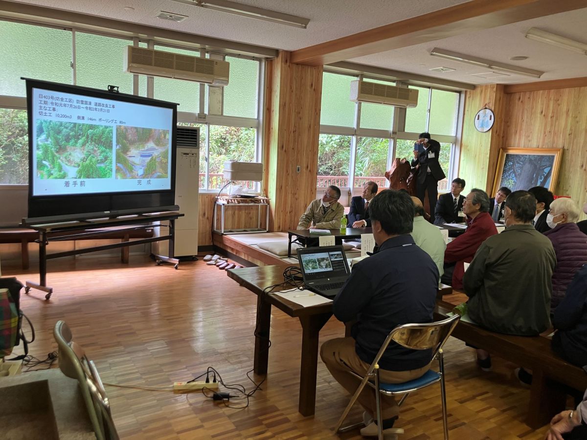 開通祝いでは、この工事を最初から最後まで担当した施工責任者が坊金改良工事の振り返りをお話させていただきました。