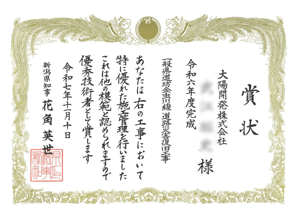 新潟県優良工事表彰を受賞した『一般県道坊金虫川線道路災害復旧工事』で施工をした社員が、優秀技術者に選定されましたので授賞式に行ってきました!