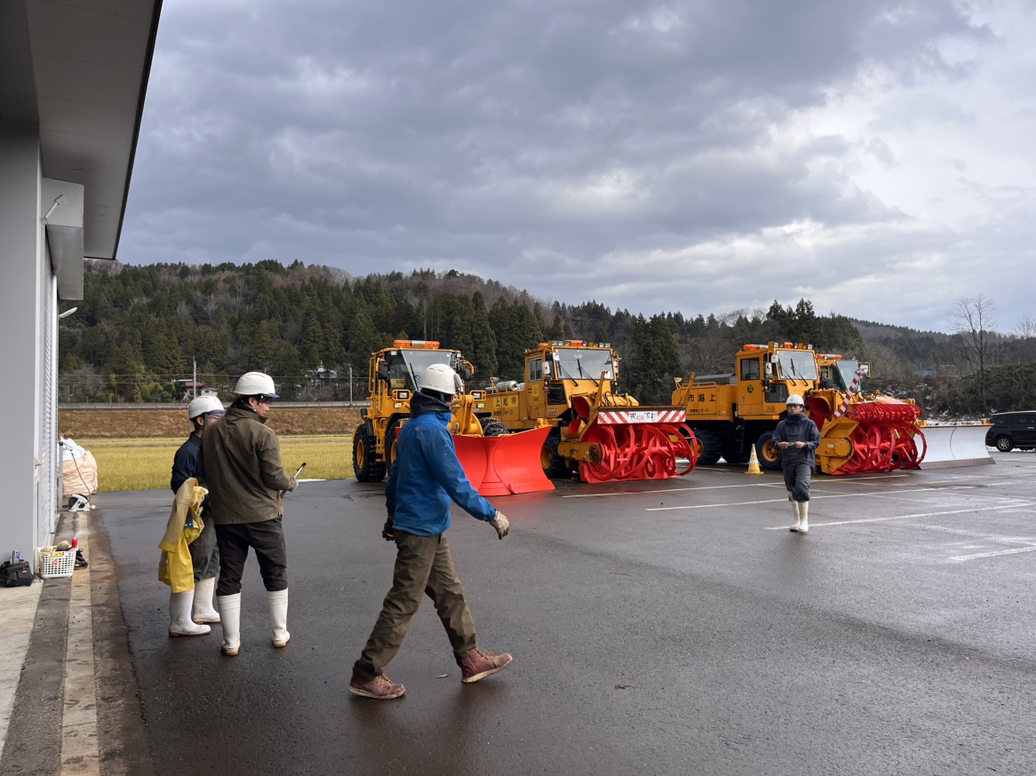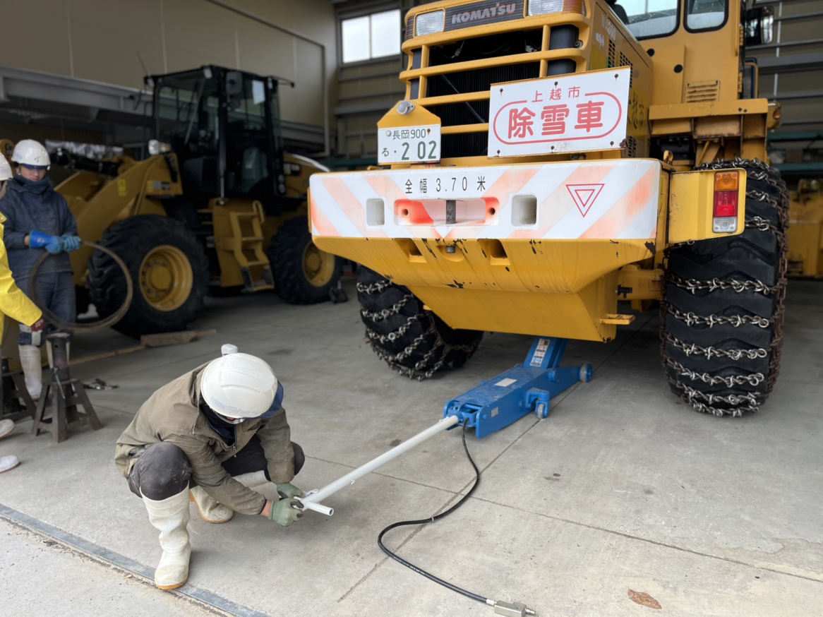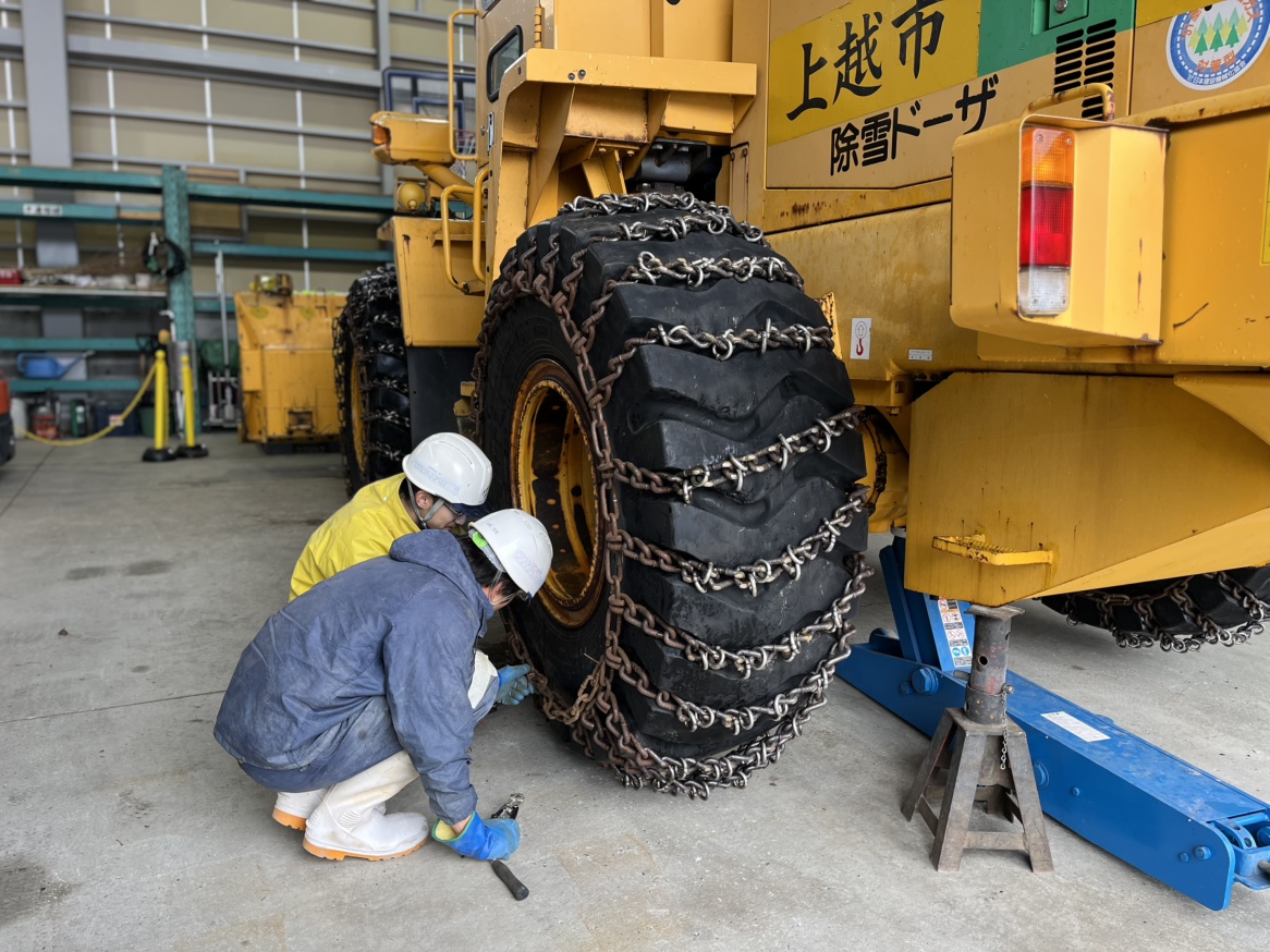 先週、降雪があり安塚区でも浦川原区でも除雪車が出動しました!週が明けて本日、除雪車のタイヤチェーンを締める作業を社員たち自ら行っていました。これが緩んでいると違和感があるらしく、乗り心地も最悪だそうです。(笑)