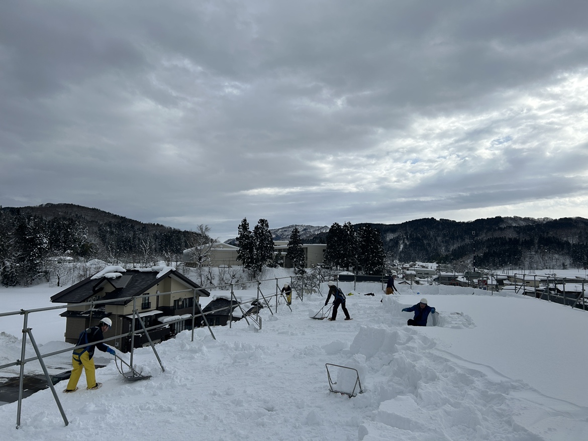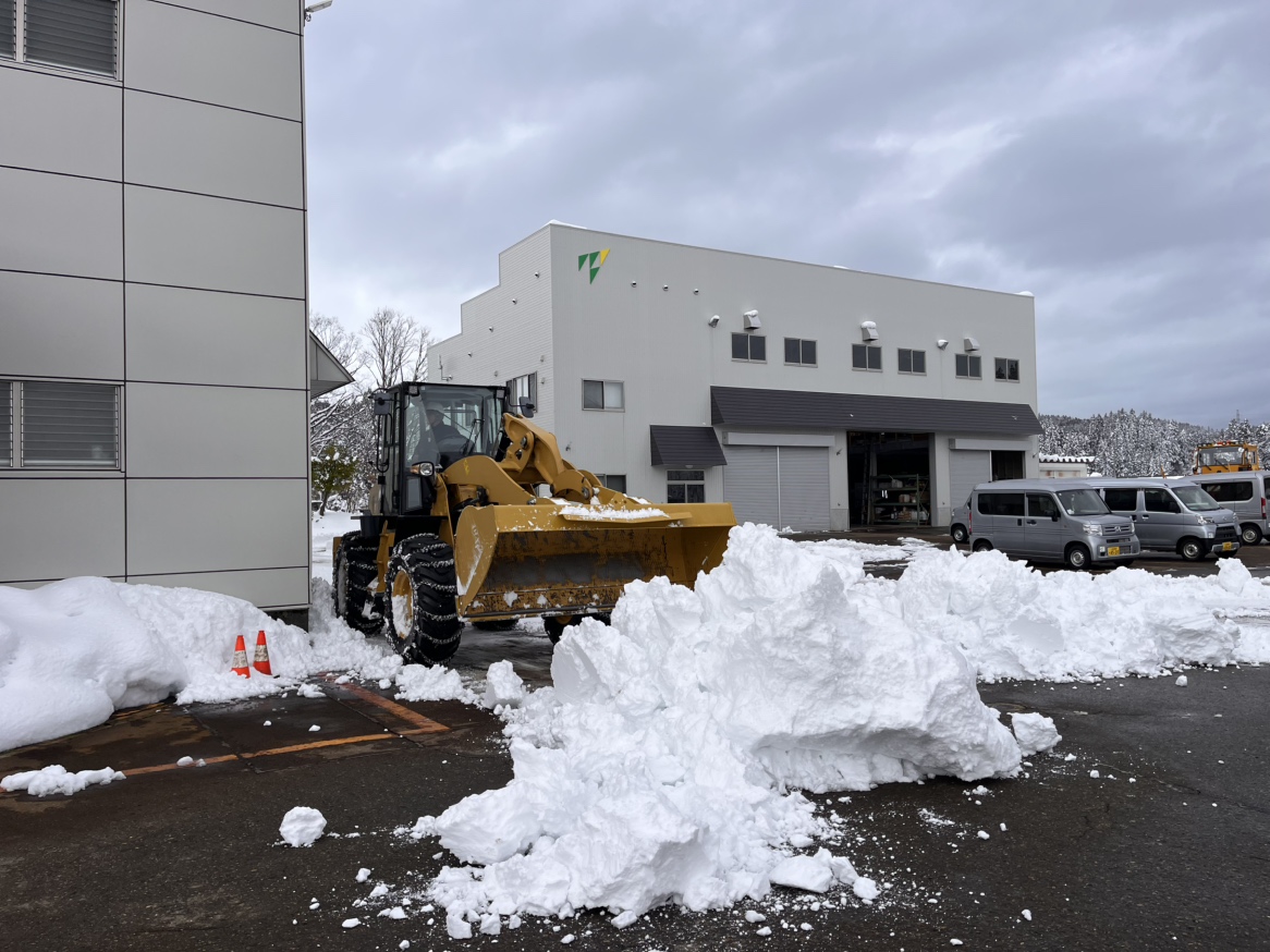 本日、本社の屋上の雪下ろしを行いました。社長や部長を含み事務所にいた7名が屋上に上がって雪を落とし、地面に落ちた雪を工事部部長がタイヤショベルで回収していました。
