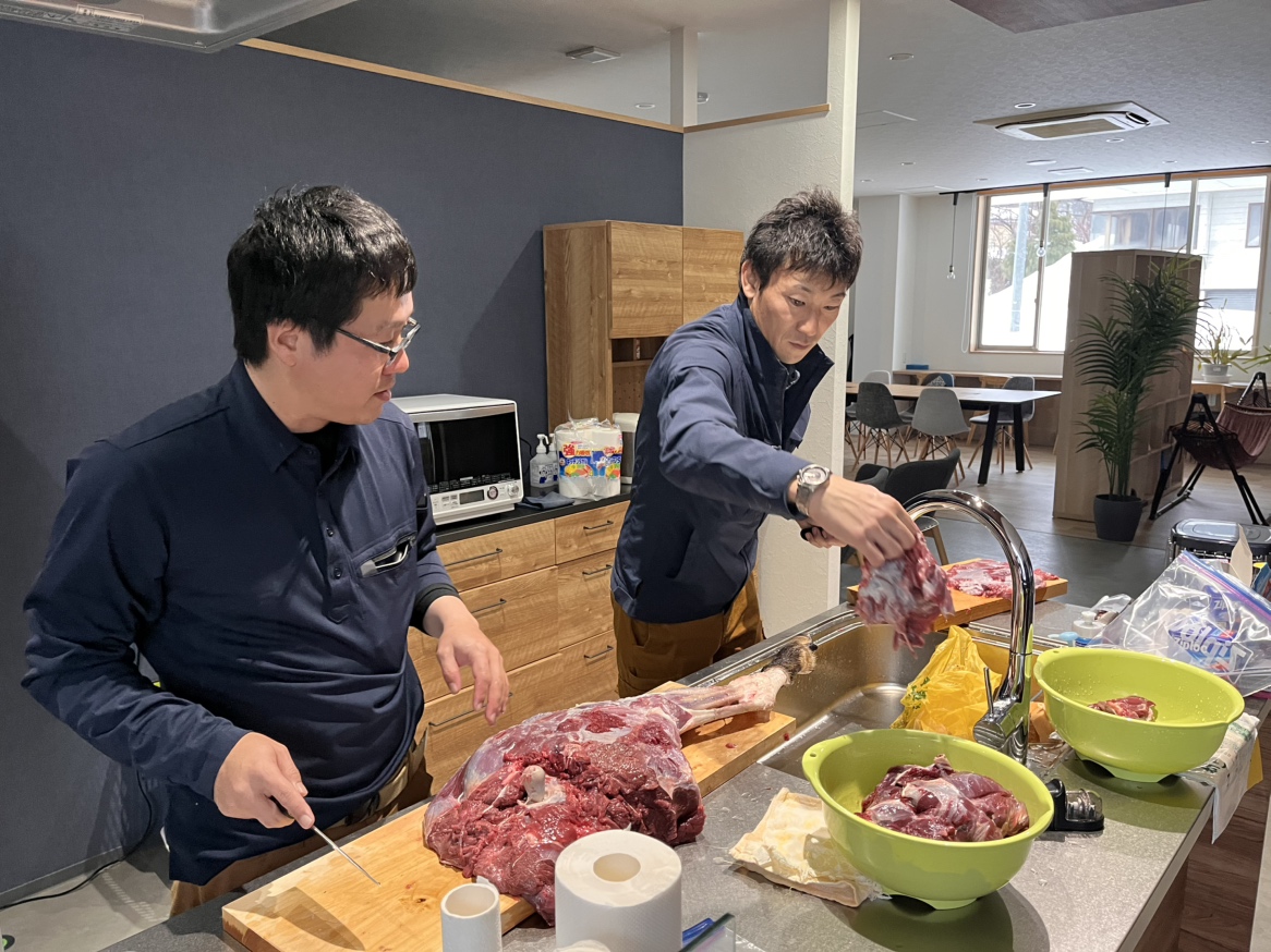 魚を捌くのが得意なTさんと趣味はソロキャンプの取締役Aさんがこちらのお肉を捌いてくれました。