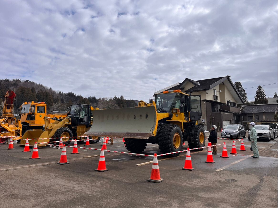 中山間地域の建設企業のお仕事として“除雪”があります。除雪作業の大切さや簡単そうに見えて難しいことを知ってもらいたかったので、ドーザーに乗ってもらいバケットの操縦まで体験してもらいました。乗車の順番が回ってくるまでは除雪車のタイヤにつけるチェーンの重さを体感してもらったり、倉庫にある小機械の実演を見てもらいました。